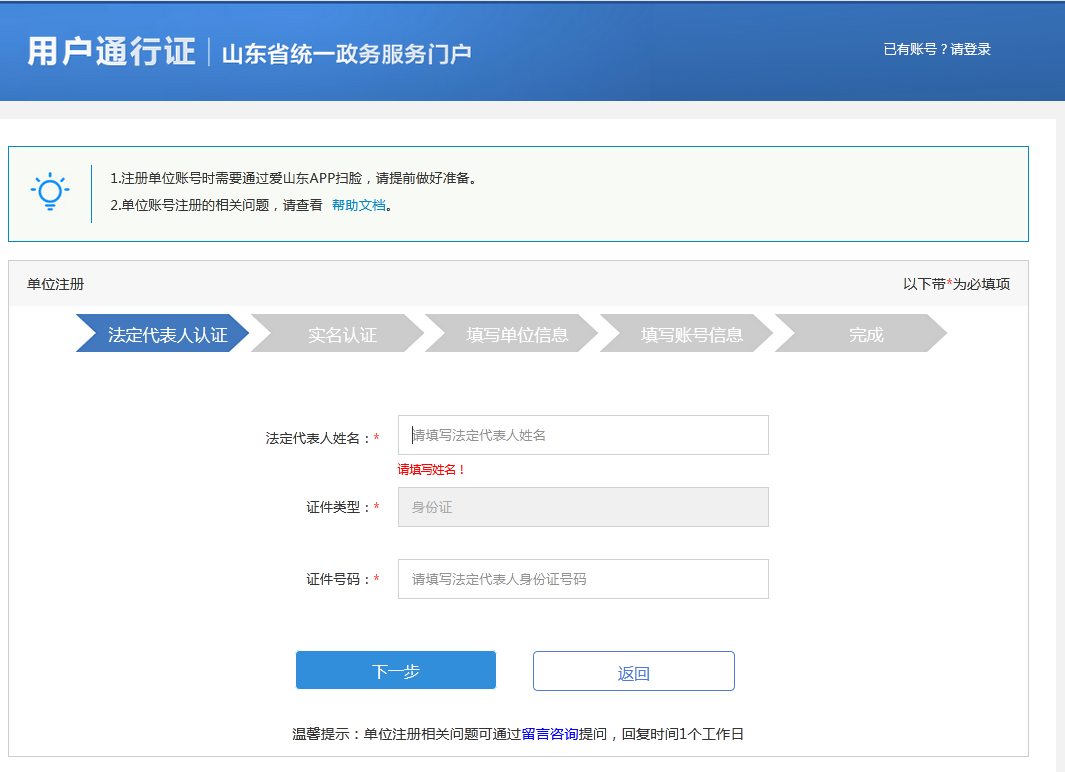 2.点击山东政务服务网(威海站)页面右上角的“注册”按钮,在账号登录窗口下方选择“单位注册”,进入单位账号注册界面,并根据页面提示填写法定代表人姓名、身份证号。
