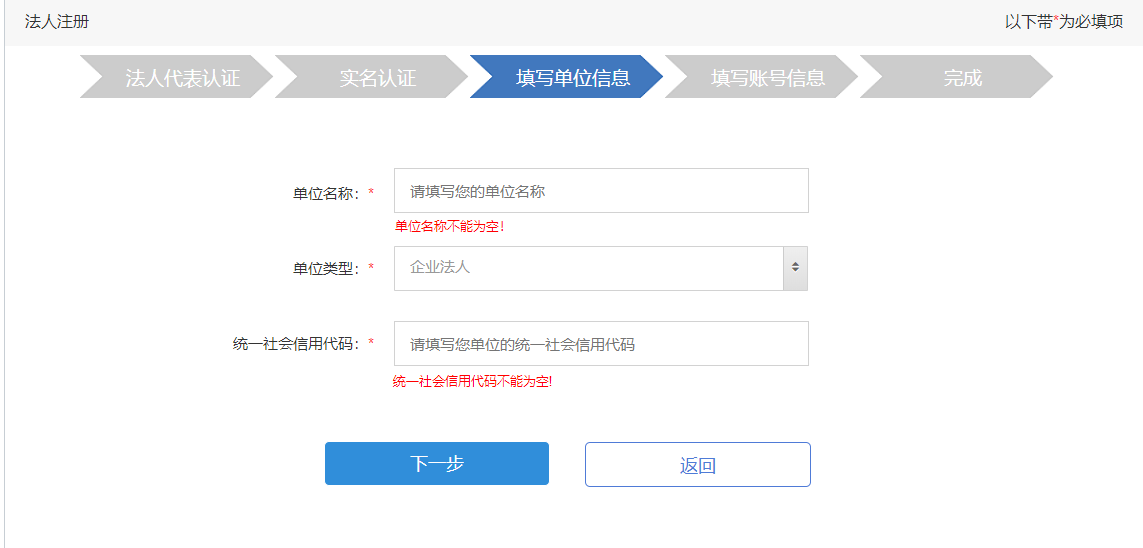 4.在“填写单位信息”界面,按照提示信息输入单位名称、单位类型、统一社会信用代码,准确无误后点击“下一步”。