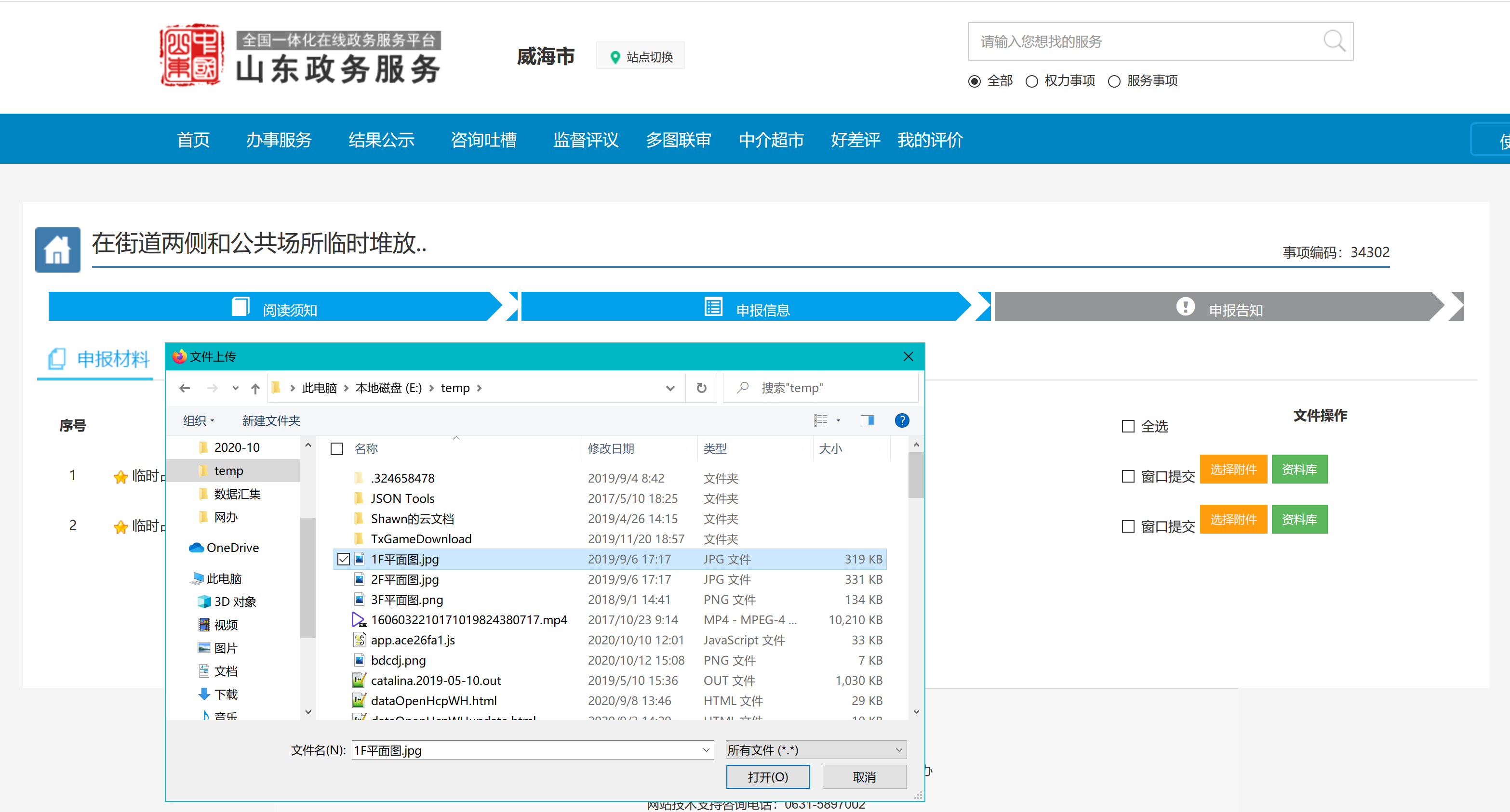 5.在申报材料界面用户既可以上传申请材料的电子版文档,也可以选择“窗口提交”。点击材料右侧的“选择附件”按钮,找到电子文档的存档位置,然后上传,上传完毕以后,点击“下一步”。