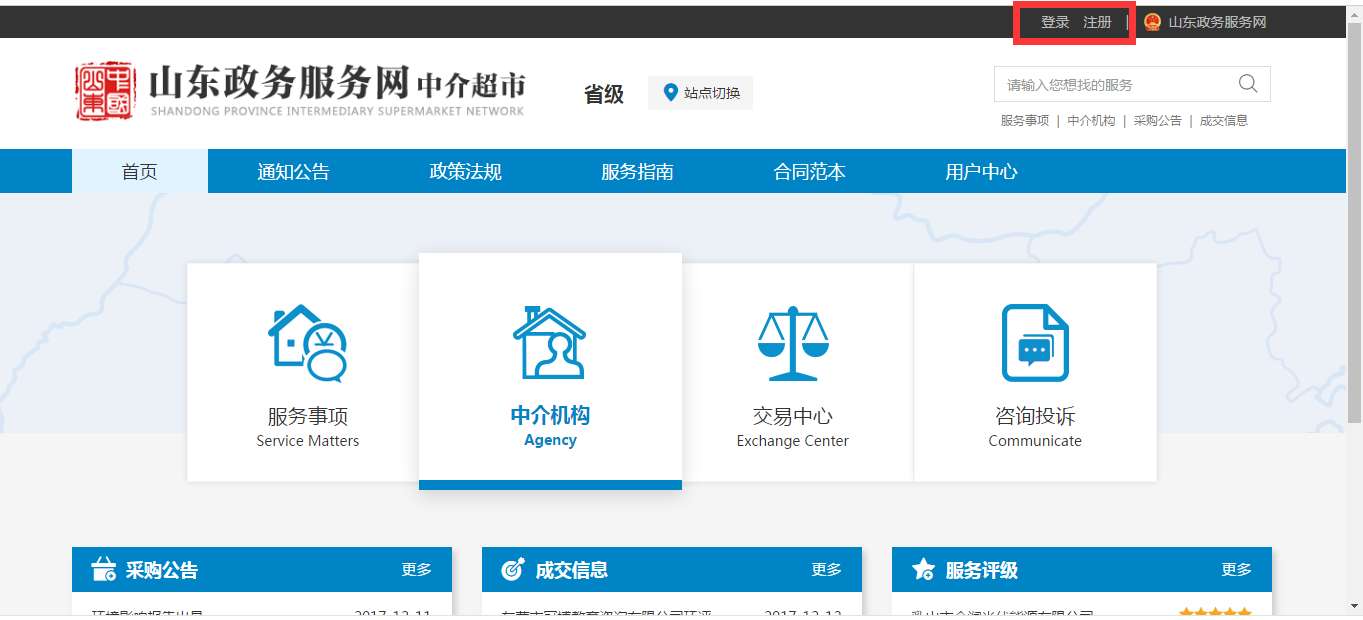 首先是导航栏,放置“通知公告”“政策法规”“服务指南”“合同范本”四个信息类的功能以及公众登录进行操作的“用户中心”。