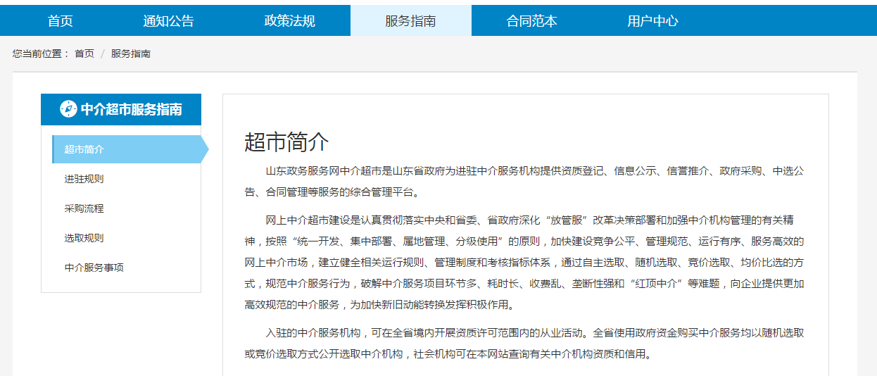 “服务指南”页面展示关于山东政务服务网中介超市的简介、进驻规则、采购流程、选取规则以及中介服务事项情况,以便采购人和中介机构对中介超市进行初步了解。(如图3)