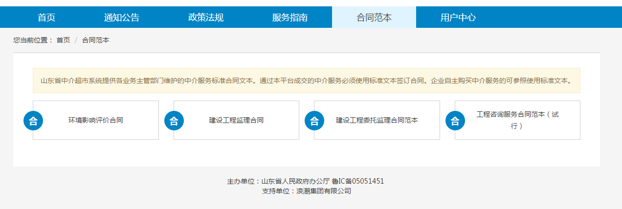 “合同范本”页面提供各业务主管部门维护的中介服务标准合同文本。通过本平台成交的中介服务必须使用标准文本签订合同。企业自主购买中介服务的可参照使用标准文本(如图4)。