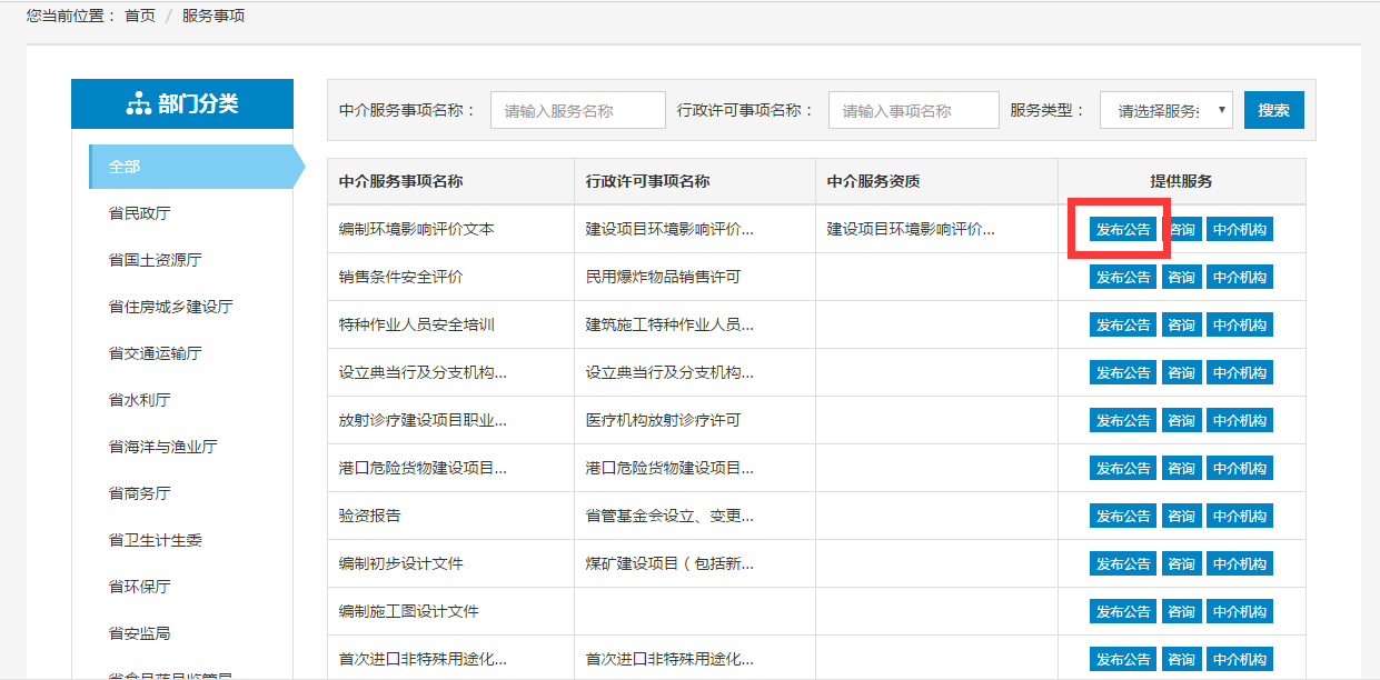 “服务事项”展示梳理的全省中介服务事项信息,根据所选的站点过滤,公众可以浏览查看相关信息(如图2),采购人可以通过“发布公告”快捷入口针对中介服务事项、行政许可事项、中介服务资质来快捷发布公告(如图3),也可通过“咨询”按钮向中介服务事项对应的中介机构和业务主管部门进行咨询(如图4),也可以通过“中介机构”快捷入口查看中介服务事项、行政许可事项、中介服务资质所对应的中介机构(如图5)。