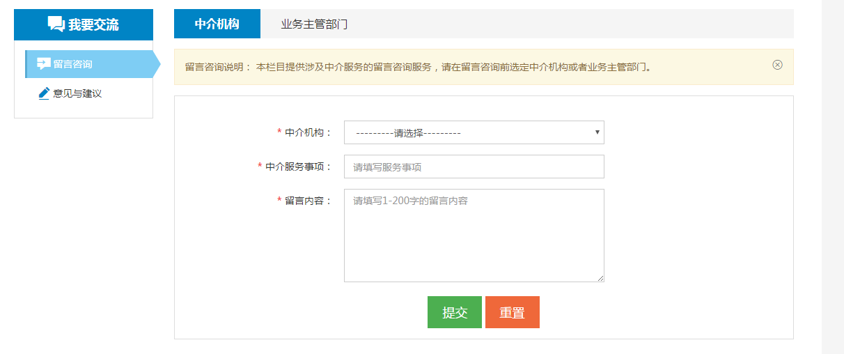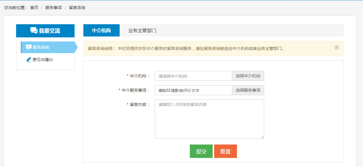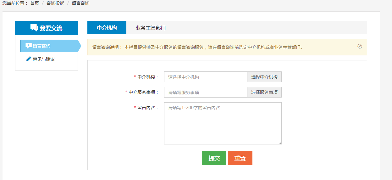 采购人、中介机构可通过“留言咨询”栏目向中介机构和业务主管部门进行留言咨询(如图16)。