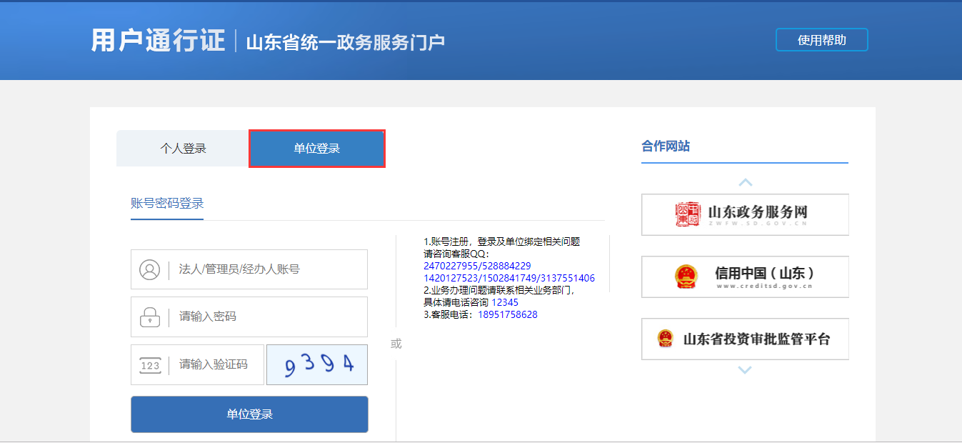 在系统首页上方点击“登录”按钮(如图1)并在山东省统一政务服务门户网站上点击单位登录输入法人账号、密码、验证码(如图2)。
