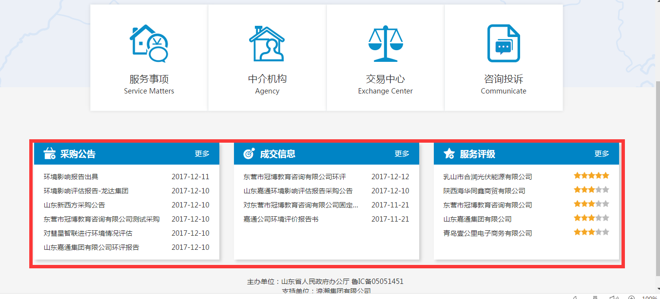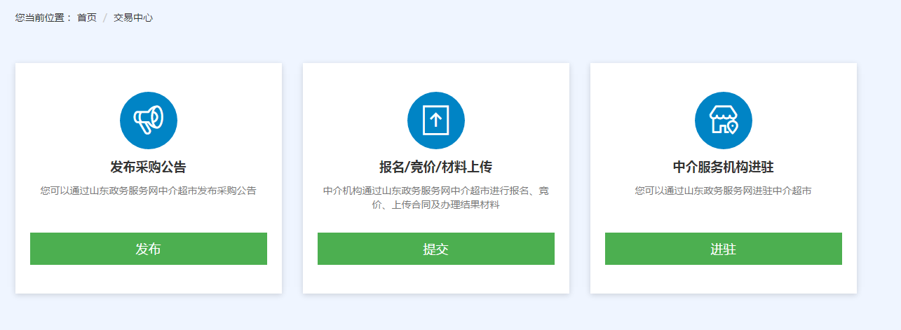 页面中央快捷入口提供“服务事项”,“中介机构”,“交易中心”,“咨询投诉”四个针对采购人和中介机构常用的功能(如图1)。