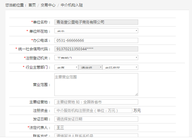 当中介服务机构对系统初步了解之后可以通过“进驻”快捷按钮直接完善中介机构信息(如图13)。