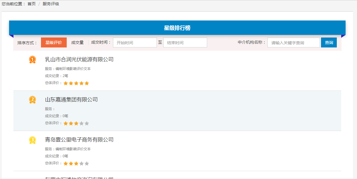 首页上“服务评级”栏目展示六个评分最高中介机构名称,点击更多,展示所有中介机构的星级排行榜,并提供星级评价、成交量、成交时间三种排序方式(如图4)。