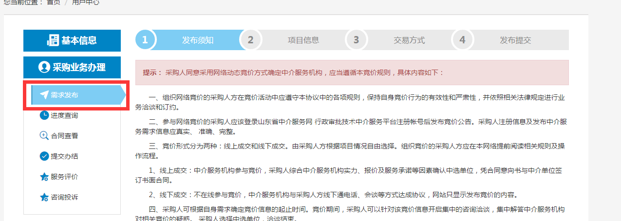 点击左侧菜单的“采购业务办理”图标下的“需求发布”(见图1),进入发布须知界面(见图2),展示出用户发布需求时需要了解的信息,点击页面下方的“同意”按钮即可开始发布需求信息