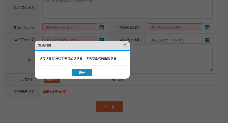 系统对填写的信息是否符合格式要求进行判断,当填入错误的格式信息时系统弹出“填写信息有误或未填写必填信息,请填写正确完整的信息!”并且信息输入框会变成红色提示框(见图3)。
