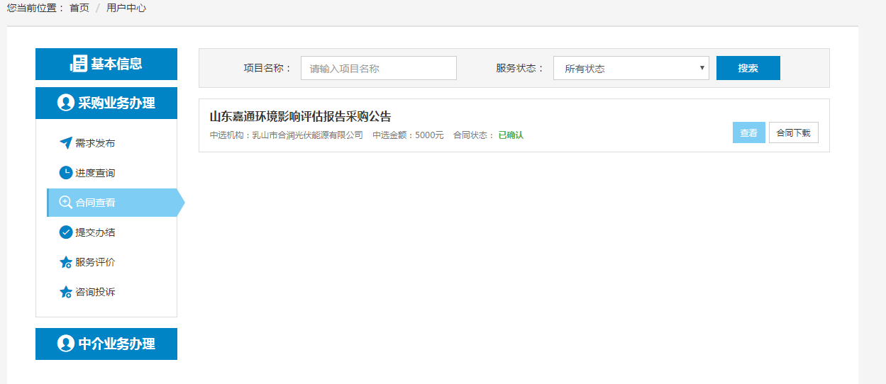 竞价过程结束后,点击左侧菜单“采购业务办理”图标下的“合同查看”即可对中选中介机构备案的合同进行查看和下载(见图1)