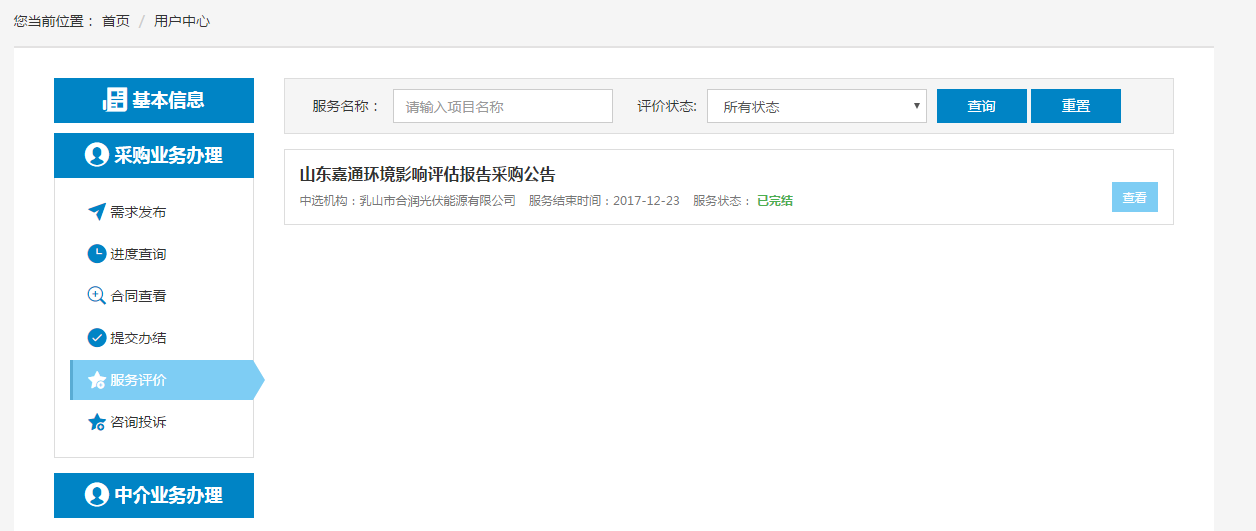 服务事项提交办结之后,采购人可以对提供服务的中介机构进行评价操作,点击左侧菜单“采购业务办理”图标下的“服务评价”,可以查看到已经办结的服务事项,并进行星级评价(如图1)。