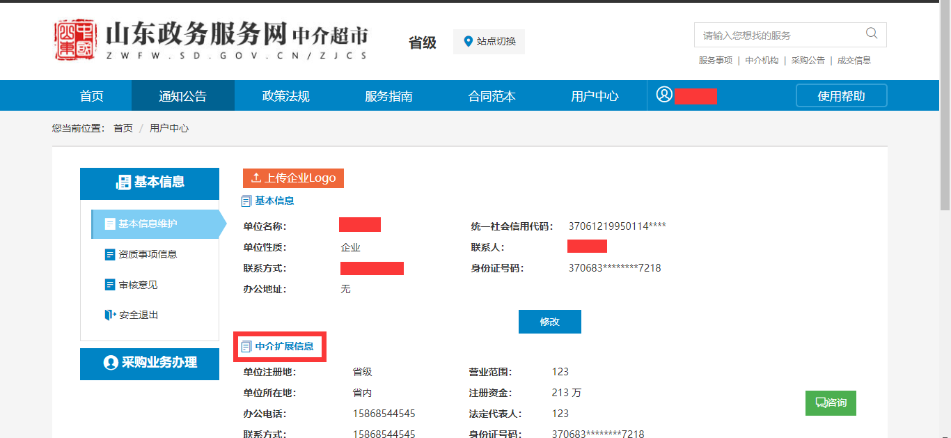 中介超市系统账号与政务服务网使用统一的用户机制,只有在政务服务网已经注册的用户才能进行中介超市系统的登录。未注册的中介机构需要前往政务服务网进行注册(http://zwfw.sd.gov.cn/)。注册、企业绑定及企业信息变更有疑问的可以在山东政务服务网上通过标题栏中‘使用帮助’找到解答,地址是:http://zwfw.sd.gov.cn/sdzw/see/cjwt/index.do?orgcode=SD37000000,账号注册,登录及单位绑定相关问题请咨询客服QQ:2639980878,客服电话:18663778981。注册成功即可前往中介超市系统(http://zwfw.sd.gov.cn/zjcs)办理中介机构进驻操作(如图1),点击菜单栏的“用户中心”,进入用户中心页面,点击页面左侧的“基本信息”标签下的“基本信息维护”完善基本信息,再点击“中介机构入驻”按钮,进行中介机构的进驻操作。用户在“中介机构入驻”中填写完成提交之后,将不会显示“中介机构入驻”按钮,在“基本信息”标签下的“基本信息维护”下会出现“中介扩展信息”(如图2),可以从此处查看和修改入驻信息。用户可以通过“基本信息”标签下的“审核意见”(如图3)查看中介机构入驻是否审核。