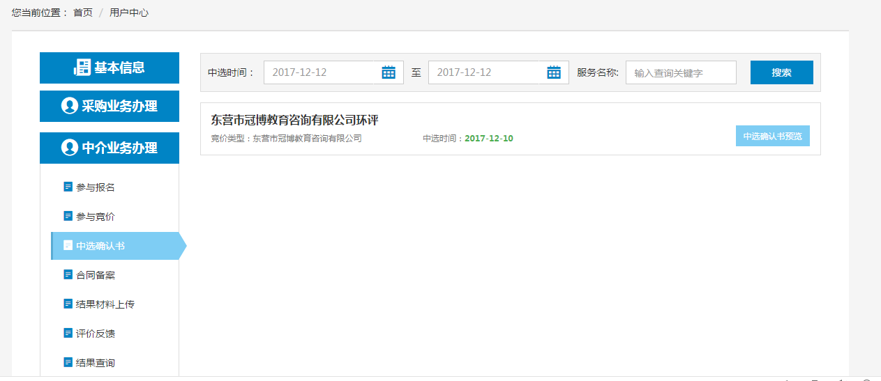 在采购人完成需求发布操作之后,点击左侧菜单“采购业务办理”图标下的“进度查询”即可查找到已经提交的需求信息及服务状态(见图1)以及中选确认书的预览(见图2)。