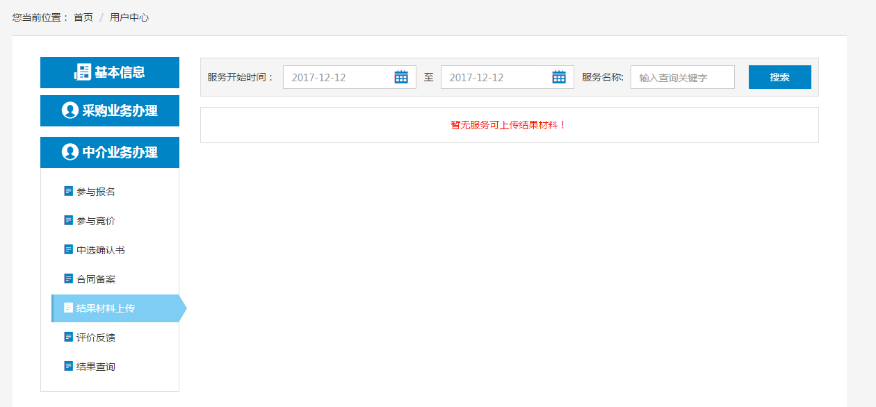 当中介机构完成对中介服务事项合同要求的内容之后,即可点击左侧菜单“中介业务办理”图标下的“结果材料上传”填写结果信息,并上传结果材料,与采购人进行结果确认(如图1)。